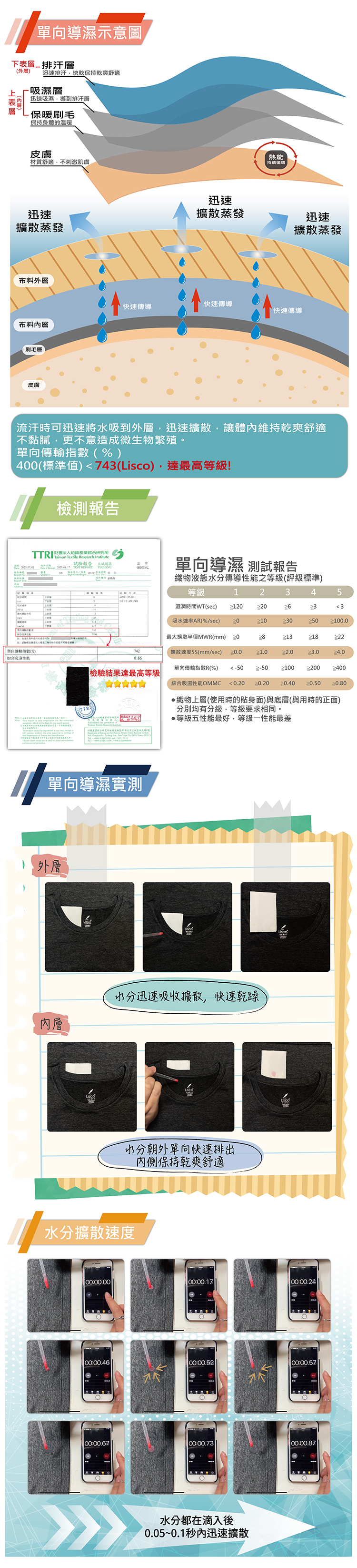 刷毛層設計讓蓄熱保暖效果實現了更舒適蓬鬆的溫暖感觸內搭持續蓄暖特性,讓您不論居家或外出旅遊都能時時感受溫暖搭配吸汗與單向導濕效果,可於流汗時快速排除肌膚上令人不適的汗水單品實測布料可將液體於 0.05~0.1 秒內迅速吸收並隨即擴散不論在保暖、單向傳輸指數或吸濕性能上都有優異表現若您對於冬季保暖有著更高期待,極暖+單導的雙重效果
